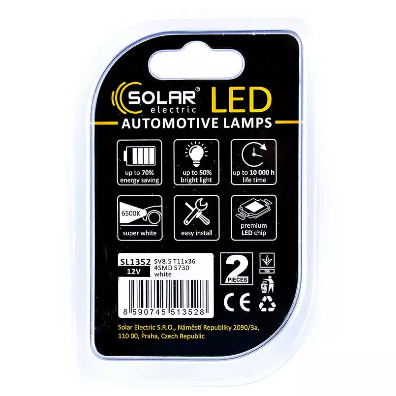 Лампочки SOLAR SV8.5 T11x36 12V 4SMD 5730 white SL1352 (2 шт.) работают от напряжения бортовой сети 12 Вольт и универсально подходит для легковых автомобилей, микроавтобусов, внедорожников, а также мотоциклов. Корпус лампы выполнен из высококачественных материалов, благодаря чему отличается великолепной устойчивостью к вибрациям или ударам, а также обладает великолепной теплопроводностью и обеспечивает эффективное охлаждение диодов.