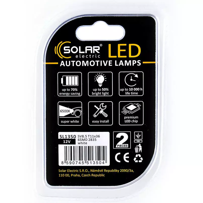 Лампочки SOLAR SV8.5 T11x36 12V 6SMD 2835 white SL1350 (2 шт.) работают от напряжения бортовой сети 12 Вольт и универсально подходит для легковых автомобилей, микроавтобусов, внедорожников, а также мотоциклов. Корпус лампы выполнен из высококачественных материалов, благодаря чему отличается великолепной устойчивостью к вибрациям или ударам, а также обладает великолепной теплопроводностью и обеспечивает эффективное охлаждение диодов.