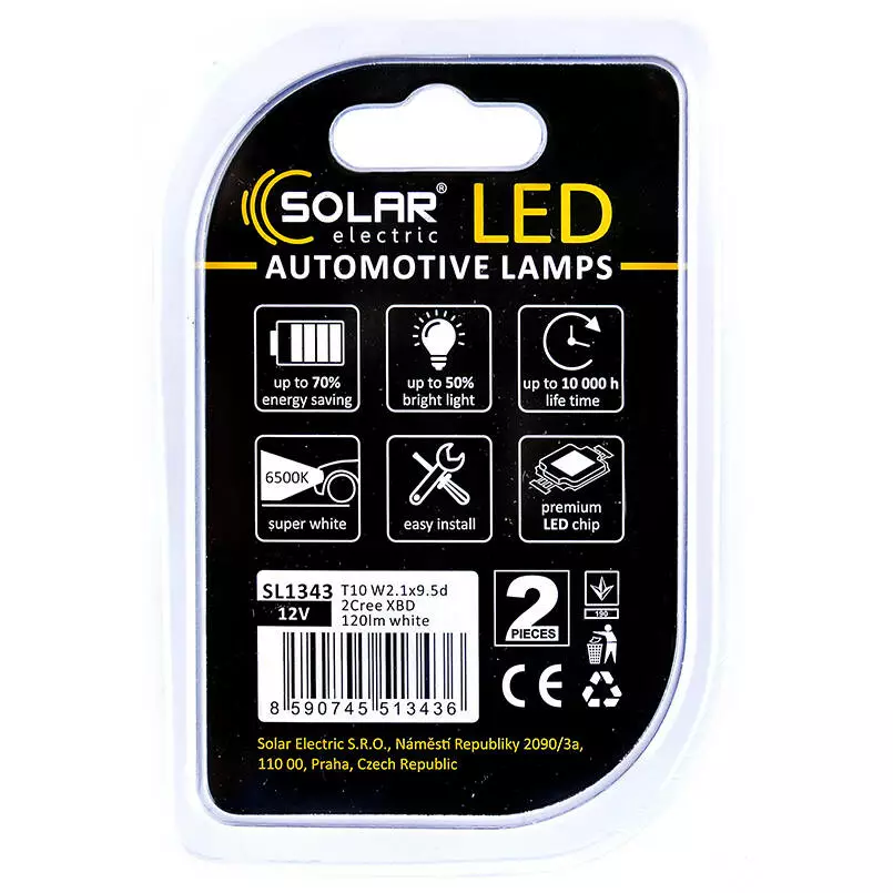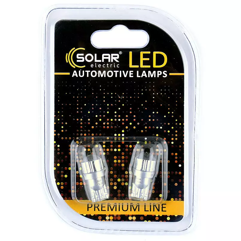 Лампочки SOLAR T10 W2.1x9.5d 12V 2Cree XBD white SL1343 (2 шт.) работают от напряжения бортовой сети 12 Вольт и универсально подходит для легковых автомобилей, микроавтобусов, внедорожников, а также мотоциклов. Корпус лампы выполнен из высококачественных материалов, благодаря чему отличается великолепной устойчивостью к вибрациям или ударам, а также обладает великолепной теплопроводностью и обеспечивает эффективное охлаждение диодов.