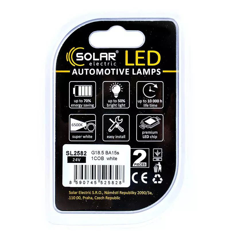 Лампочки SOLAR G18.5 BA15s 24V 1COB white SL2582 (2 шт.) работают от напряжения бортовой сети 24 В и универсально подходит для грузовых автомобилей. Корпус лампы выполнен из высококачественных материалов, благодаря чему отличается великолепной устойчивостью к вибрациям или ударам, а также обладает великолепной теплопроводностью и обеспечивает эффективное охлаждение диодов.