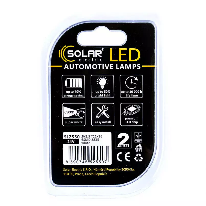 Лампочки SOLAR SV8.5 T11x36 24V 6SMD 2835 white SL2550 (2 шт.) работают от напряжения бортовой сети 24 В и универсально подходит для грузовых автомобилей. Корпус лампы выполнен из высококачественных материалов, благодаря чему отличается великолепной устойчивостью к вибрациям или ударам, а также обладает великолепной теплопроводностью и обеспечивает эффективное охлаждение диодов.