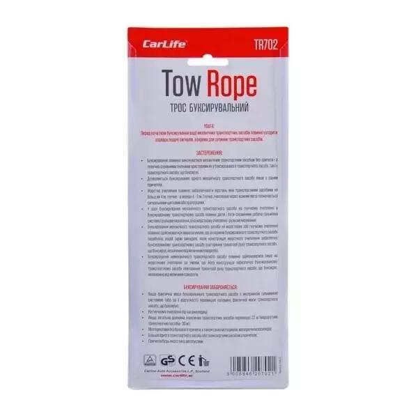 Для решение таких задач идеально подойдет Трос буксировочный CARLIFE 3 т 4 м TR702 который обладает такими характеристикам: